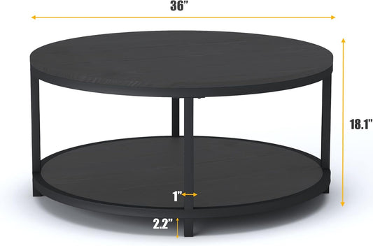 round Coffee Table, 36" Rustic Wooden Surface Top & Sturdy Metal Legs Industrial Sofa Table for Living Room Modern Design Home Furniture with Storage Open Shelf (Black Oak)